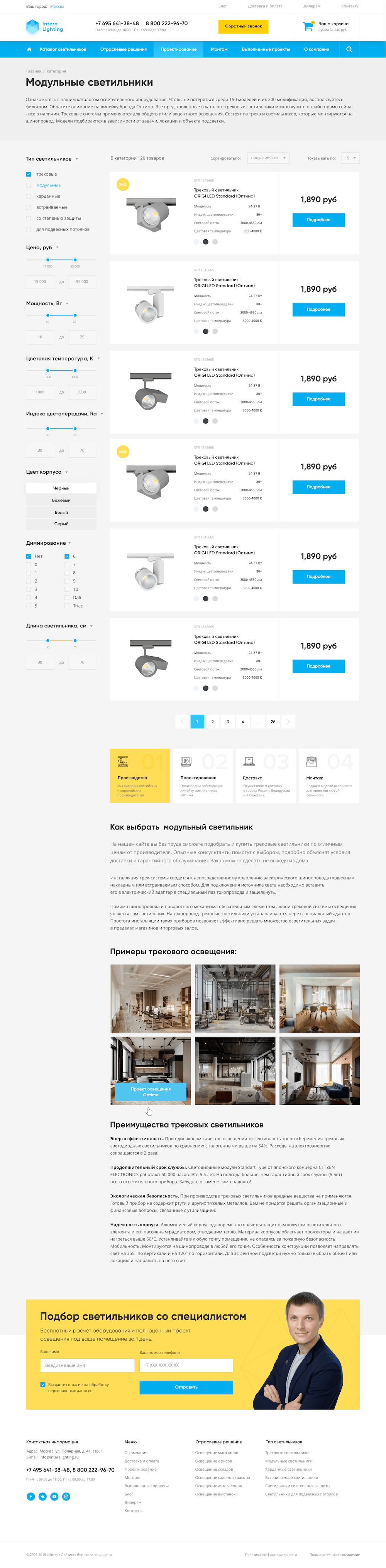 Каталог разбили на категории и подкатегории в соответствии с запросами (модульные светильники / модульные светильники для магазина / модульные светильники для офиса и т.д.)