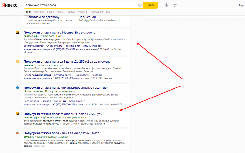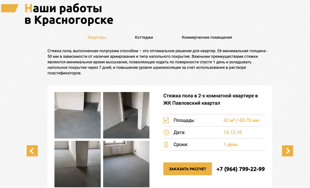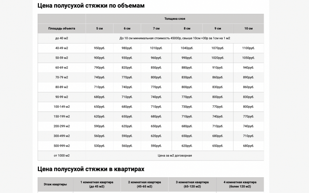 Значительная доля семантического ядра, которую нельзя упускать – это вопросы со словом "цена". Чтобы выйти в ТОП выдачи по запросам вроде «полусухая стяжка цена» или «штукатурка стен сколько стоит за квадратный метр», нужно было указать цены на сайте.