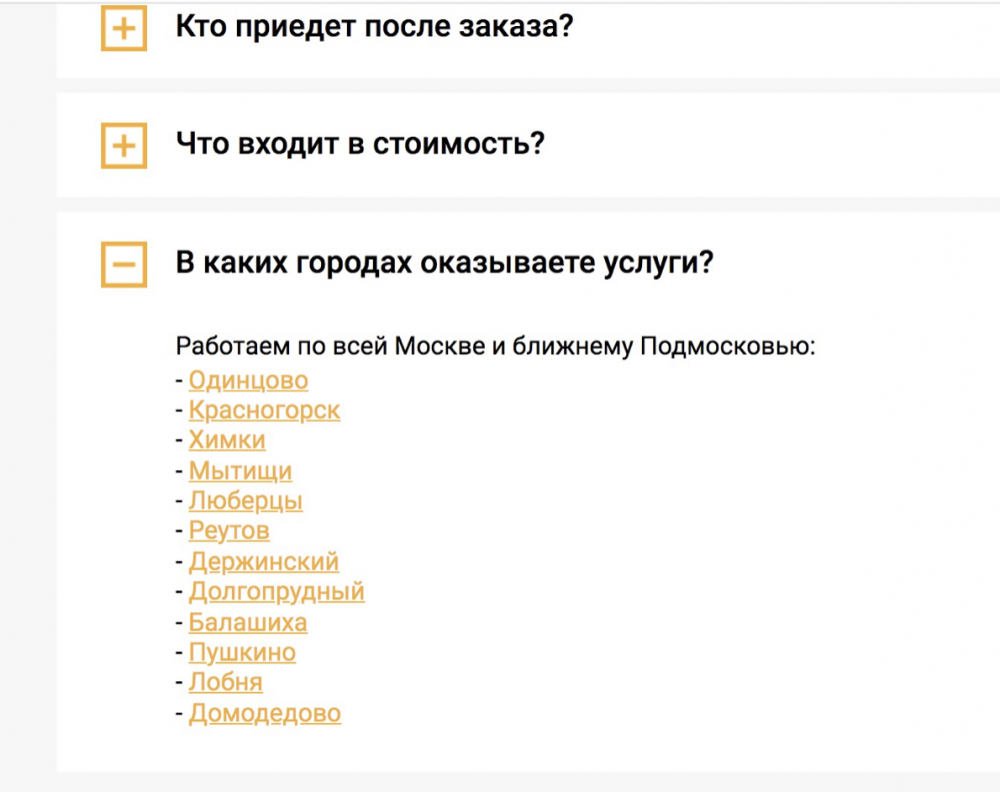 На каждой посадочной – цены, УТП, а также фотографии работ именно в этом городе. Благодаря таким страницам у нас получилось выйти в ТОП поисковых систем в 12 ближайших подмосковных городах. Страницы и сейчас находятся на первых местах выдачи, ведь у конкурентов нет посадочных под разные города.